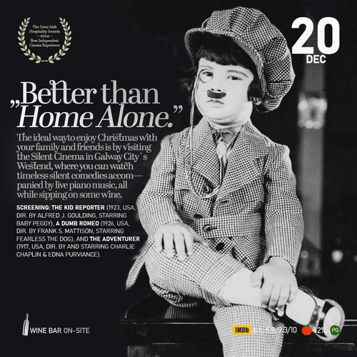 The best way to celebrate Christmas with your loved ones is by visiting the Silent Cinema in Galway City's Westend. Here, you can enjoy classic comedies while listening to live piano music by Agustina Taborda, all while savoring a glass of wine. Join us on December 20th for screenings of The Kid Reporter (1923), A Dumb Romeo (1926), and The Adventurer (1917). We would like to express our sincere gratitude to the San Francisco Film Preserve for supplying us with restored versions of the first two films of te night!