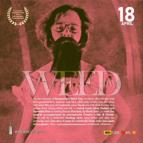 On the occasion of International Weed Day, we invite all potheads with their grandchildren, mothers with their adult sons, twenty-year-old wives with their fifty-year-old husbands, nuns, Napoleons with their doctors, to a unique show during which you will >>>watch iconic silent Dadaist and Surrealist films (including famous Entr'acte, by René Clair), >>>with live musical accompaniment by percussionist Gustavo Lobão & friends.